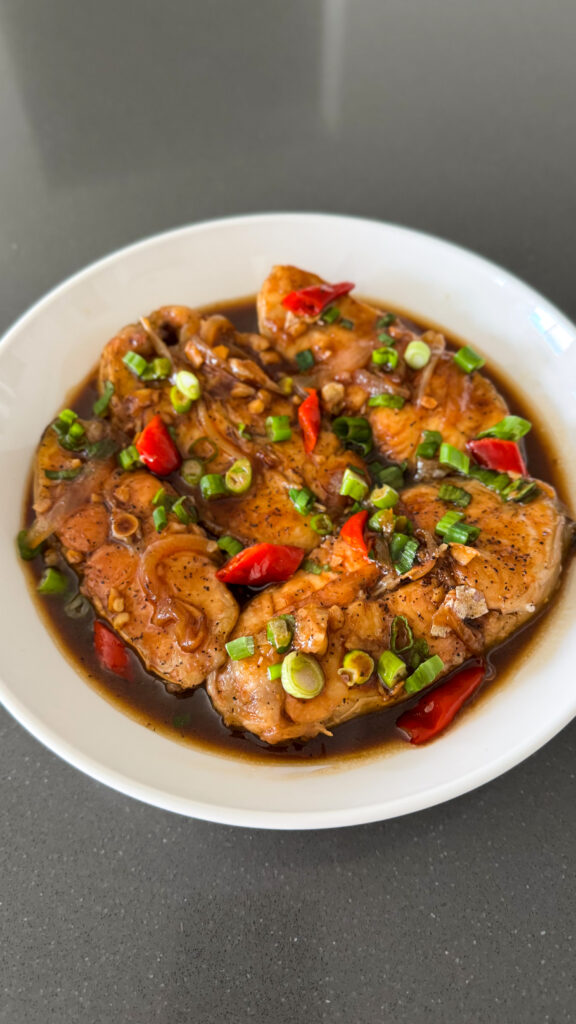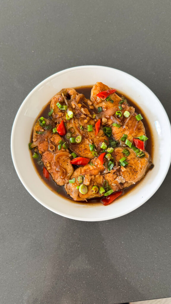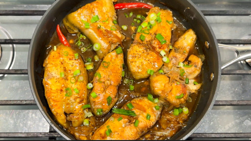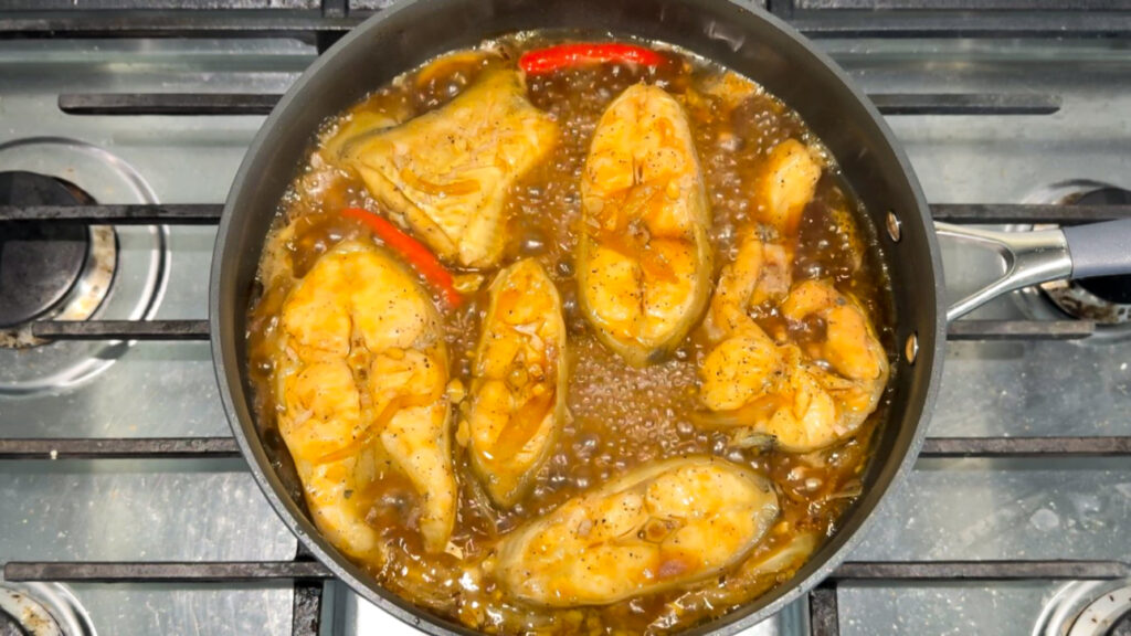 Sear fish 2–3 mins per side. - Braise with marinade, water and chilies for 20–30 mins until glossy.