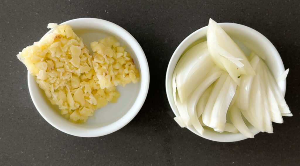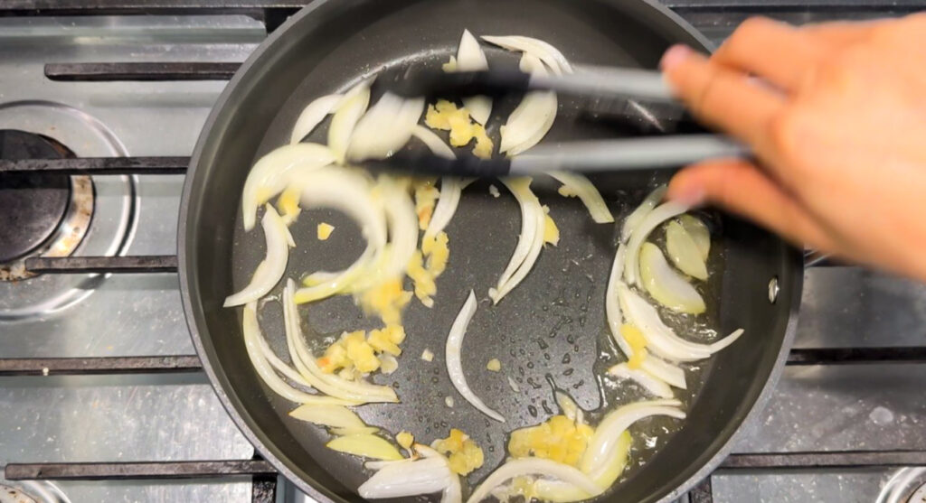 - Sauté garlic + onion until fragrant.