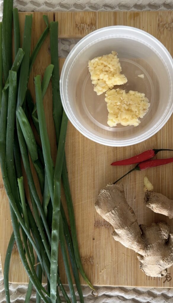 2. Add the minced ginger, garlic, and chili. Mix well and let it sit for a few minutes so the flavors come together.