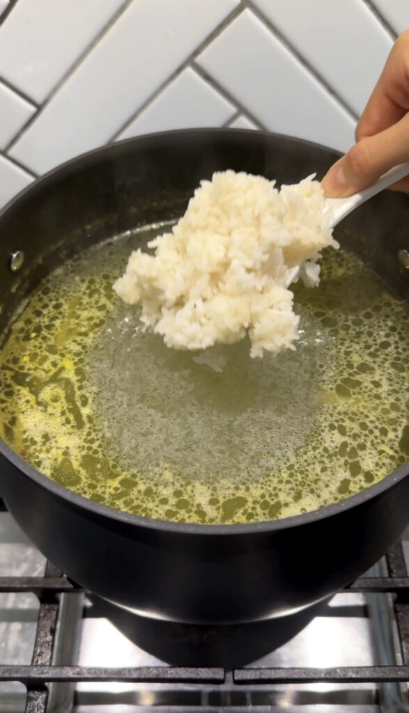 Once simmered in broth, the grains soften and expand, slowly turning the soup into that signature porridge texture.