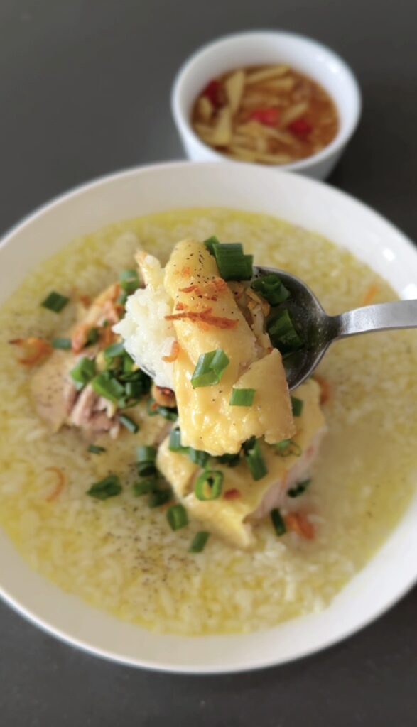 Cháo gà specifically is chicken congee. Traditionally, it’s made by simmering a whole chicken with rice until the grains break down and thicken the broth into a creamy porridge.